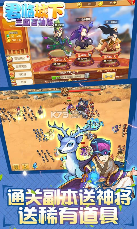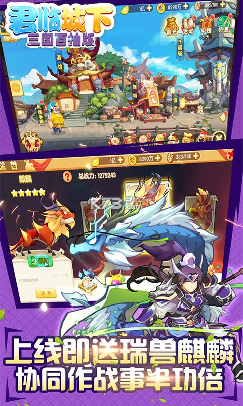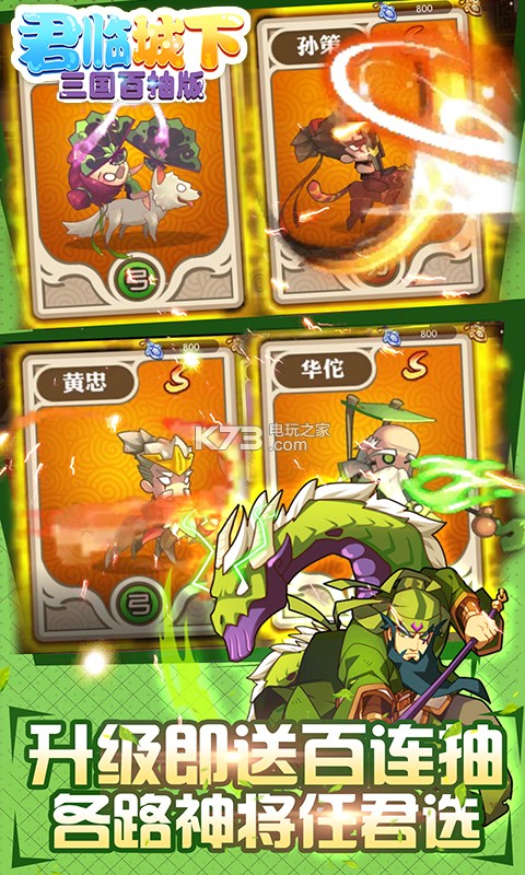 升级即送百连抽,吕布,诸葛亮等神将随你抽,游戏将瑞兽元素融入到三国题材中,加上颠覆性无节操剧情,给玩家带来与众不同的体验。