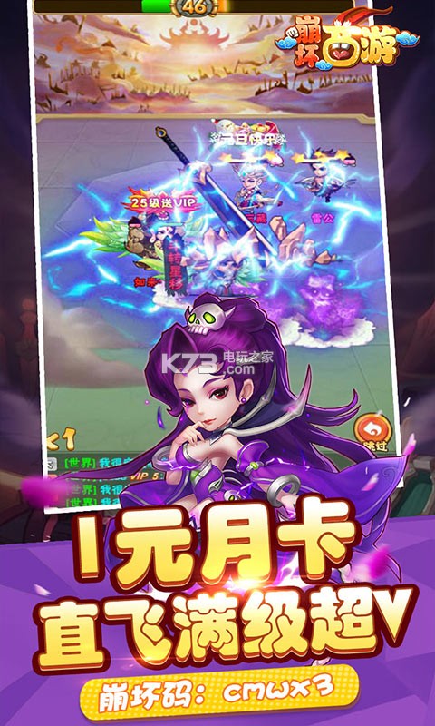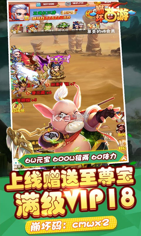 《崩坏西游送648元》一款以西游记为背景,采用Q版2头身的即时制策略养成;上线赠送VIP18和至尊宝,60000元宝,600W银两,60体力,畅享西游梦,达到一定条件我们还送648元模拟充值,1元月卡,直接飞升满级超V,这是什么宝藏游戏!
