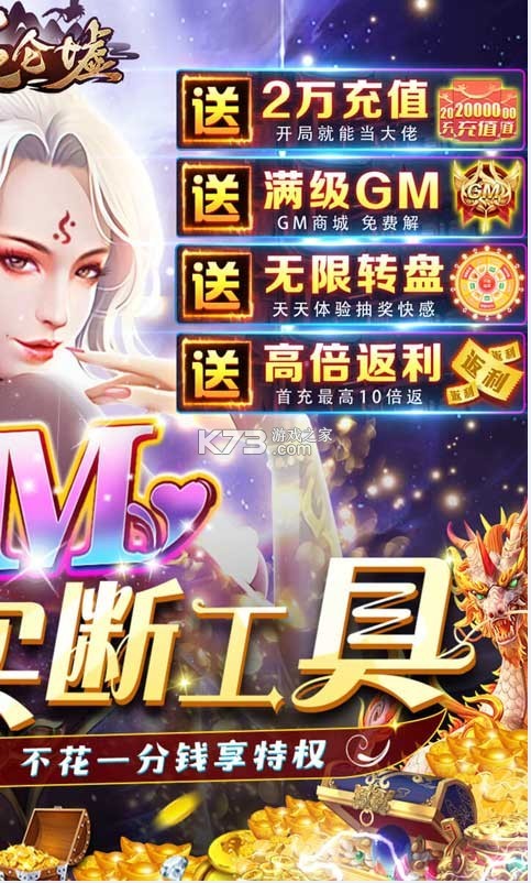 《昆仑墟送满级GM版》全新福利版本来袭,游戏首充直接赠送vip银钻特权,升级更迅速,还可以一键离线挂机,上线自动获取收益,日常副本boss限时活动直接获得高阶装备,还有无限转盘,无限抽道具。