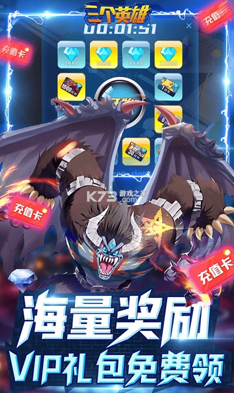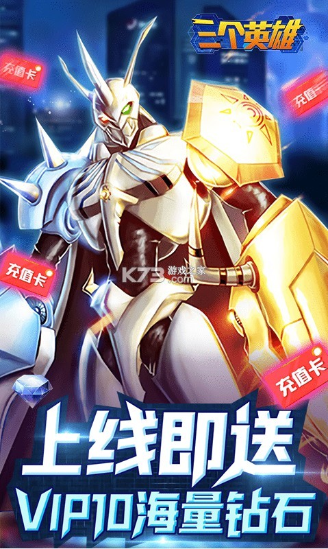 1.上线既送VIP10, 赠送188888钻石,100万金币,超2000元真充卡!
