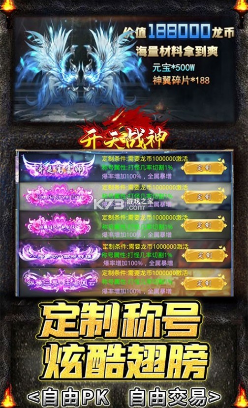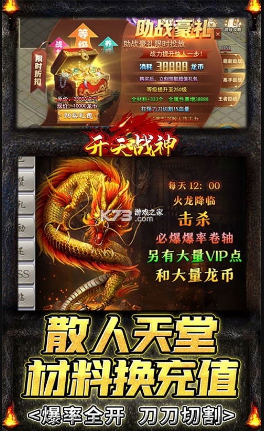 《开天战神高爆版》是一款全新版本传奇世界游戏,游戏采用了超变忘忧版本,刀刀切割,打小怪也能直接爆屠龙宝刀,boss材料可直接换充值货币,0氪档也能玩,还有海量地图直接免费进入打怪。