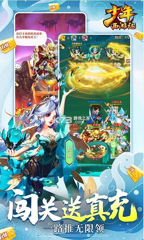 《少年西游记共享充值版》是一款全新福利版本的西游题材游戏,全服共享充值进度,0氪档也能直接当大佬,免费领取累充活动,还有超高的返利内容能够直接获取,推图即可无限制送真充卡。