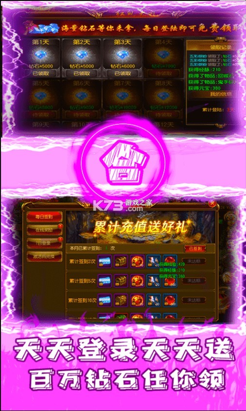 3、七日登录送10000元充值卡,更有海量材料,技能书,顶级宝石倾情相赠!