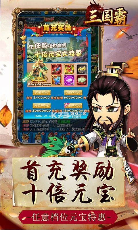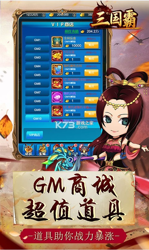 《三国霸GM商城版》是一款将三国故事和中国神话相结合的回合制挂机类游戏,玩家能够在游戏中来见到三国时期的武将和上古时代的神兽等,招募武将,培养神兽,制霸三国时代,还有超多福利领取。