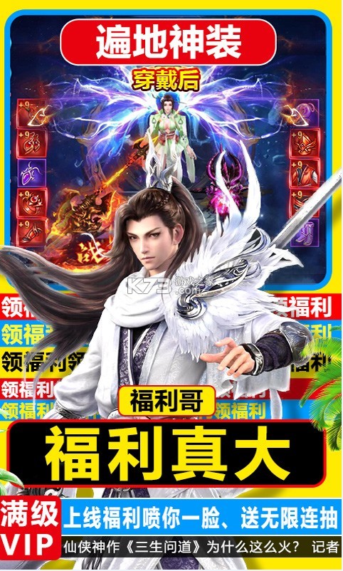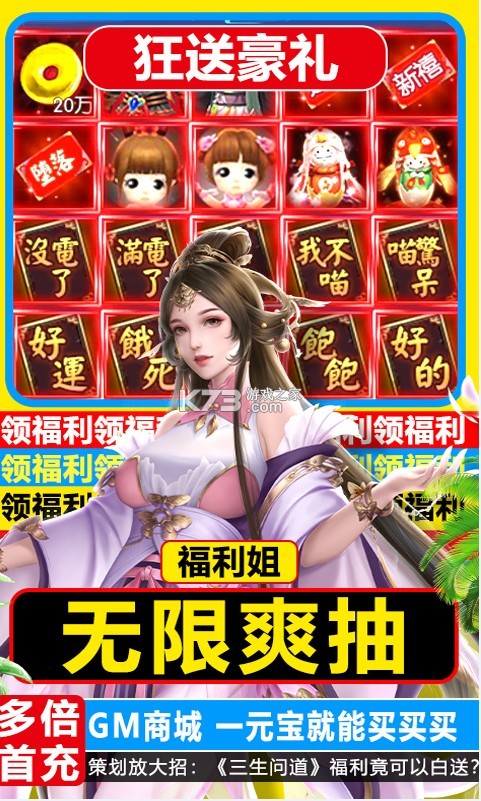 2.上线即得100000元宝,1500000绑元,1500000铜钱,秒升GM1,开启GM商城,开服无限充值活动天天抽充值卡!更有万元充值卡直接送!