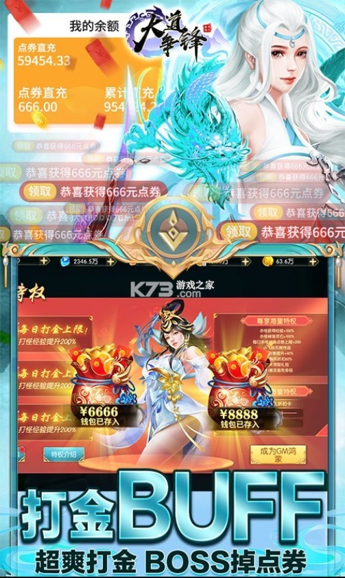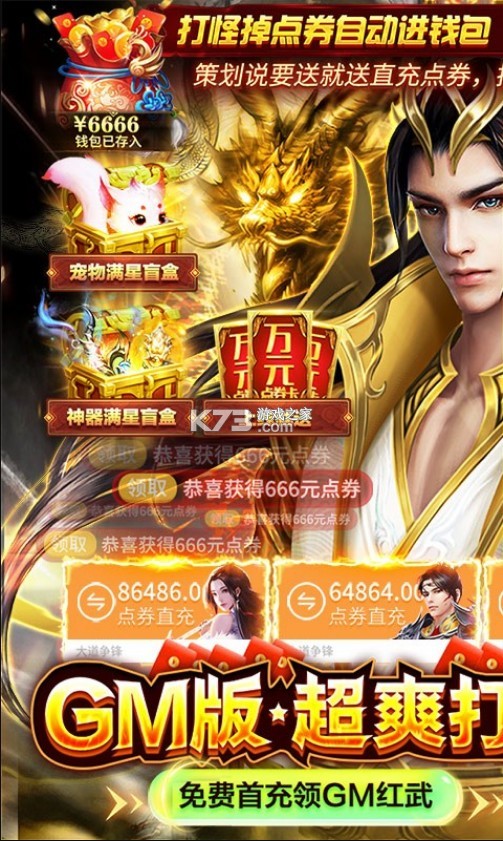【全新版本】免费直充版,升级立送仙尊GM特权瞬间开启BUFF,打怪掉点券直接进入钱包,免费直充抵扣现金充值;更能免费解锁海量GM特权!