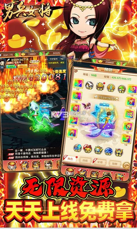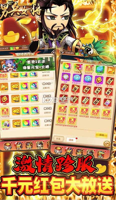《男兵女将-送1W代金券》是一款超BT的回合制挂机游戏,游戏福利暴力提升,万元代金券上线就送,每天送红将,红将全免费,GM特权,每日活跃任务保底赠送200w元宝,7日登陆再送1000万元宝;让你元宝不愁花,材料买到嗨;同时游戏武将,宠物,坐骑随意搭配,等你来挑战最强阵容!