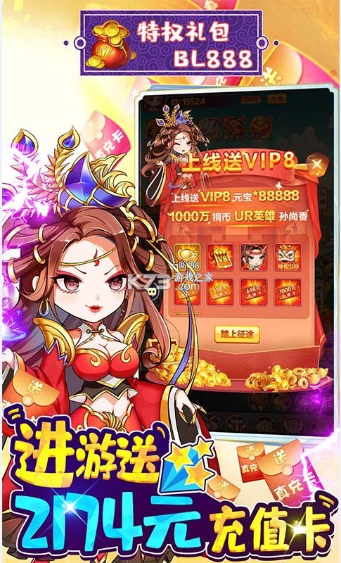 福利1:上线赠送VIP8,元宝88888,铜币*1000W,2174元充值卡,UR英雄。