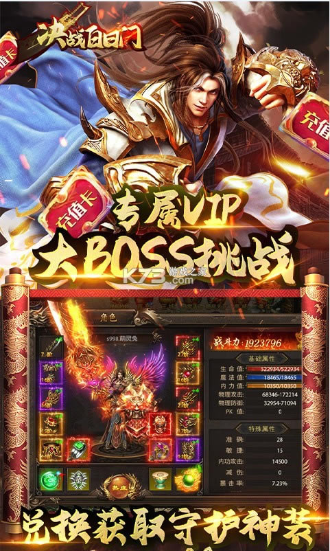 2.畅享vip1-vip20上万战力加成特权,更有专属VIP大boss挑战,兑换获取守护神装。