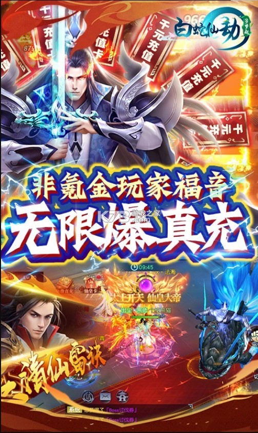 3.全方位收割真充卡,上线送真充、升级领真充、boss爆真充、登录抽真充,做到真正的来玩就送,每天不花一分钱即可完美续航!