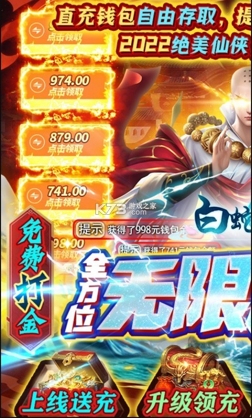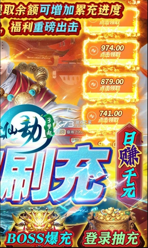 2.版本特色刷充功能,1000%极速打金,参与主线、经验魔窟、击杀boss均产出打金卡,瞬间帮你填满直充钱包,钱包自由存取,提取余额可增加累充进度!