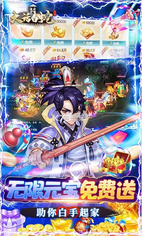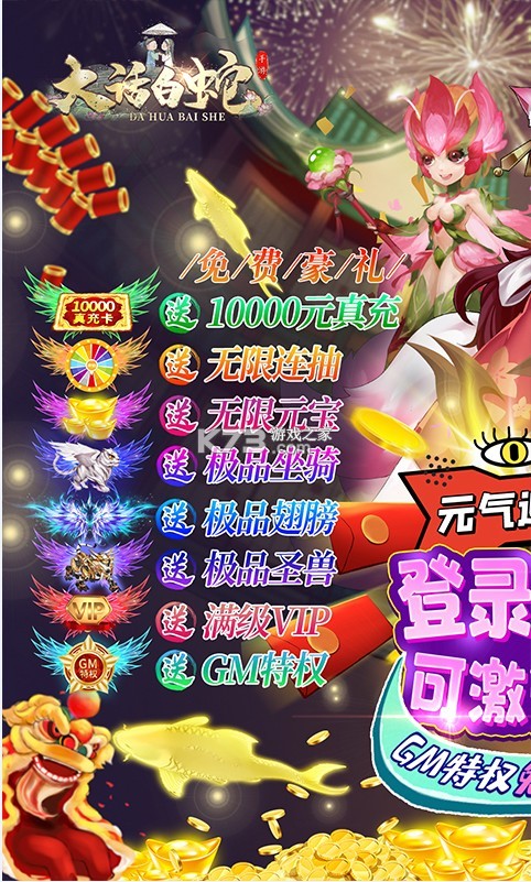 《大话白蛇》是一款仙侠类回合制手游,突破传统回合制观念,搭配各路萌宠,以一控三助你横扫三界仙魔!登录送万元真充,可激活线下自动返利,让你体验内部福利号的游戏快感。各大职业,相生相克,你的人生由你主宰,你的命运由你掌控,只为让你体验经典非凡的修仙之路!是经典回合手游力作,继承传统回合制玩法,独创后台挂机、道具回收元宝等玩法,挂机产出海量道具、装备,一键回收得元宝,日常奖励海量提升,神兽、仙侣、坐骑、时装等应有尽有;故事背景设立于中国古代隋唐时期,融入了上古神话元素,为玩家们打造出一个恢弘大气的仙侠世界,游戏场景写实,画面精美,配乐方面采用唯美的古典音乐,视听的完美结合将带来更强的代入感;游戏玩法简单丰富、日常福利壕无人性,绝对值得少侠畅玩一番,展开一段波澜壮阔的仙侠奇缘!