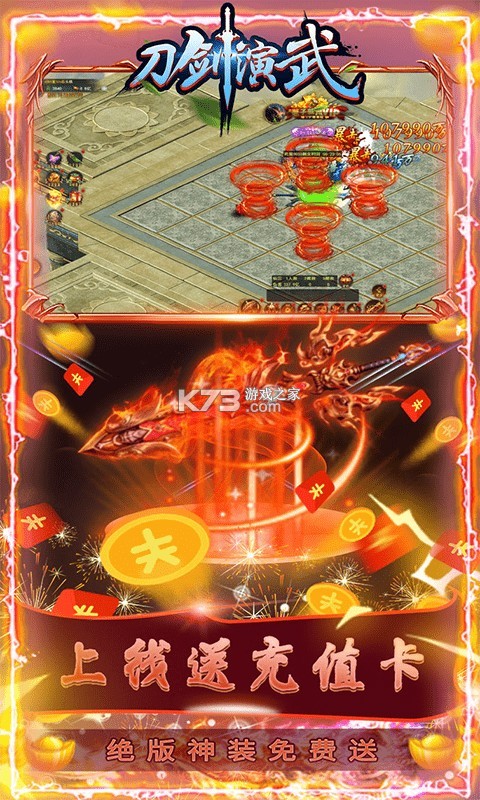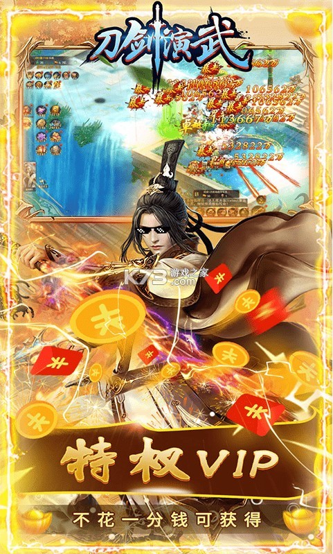 来玩登录就送至尊8,价值千元的礼包免费领取,特权VIP不花一分钱即可升满,打开VIP礼包还有充值卡赠送!上线有千元充值卡,更有GM扶持礼包,绝版GM装备送!这是一款即时战斗类仙侠风格的游戏,各类仙器法宝多重变身,脚踩飞剑、背装绝美翅膀、怀抱绝世美人,手握无上神兵,灭天灭地灭鬼神!《刀剑演武》是一款Q萌的ARPG角色扮演仙侠题材游戏,游戏技能华丽震撼,配备绝美的仙羽和激萌坐骑贴身跟随,游戏中采用绝美的奇幻仙境,营造出沉浸式的修仙体验感。游戏特色:唯美古风,养心设计,手绘原画光影同步,古典国风完美融入,奇幻仙境高能特效,完美仙界近在眼前。千里姻缘,约定三生 好友结婚喜庆婚礼,甜蜜双修夫妻探险,定情新服再添战力,成双成对畅游仙界。