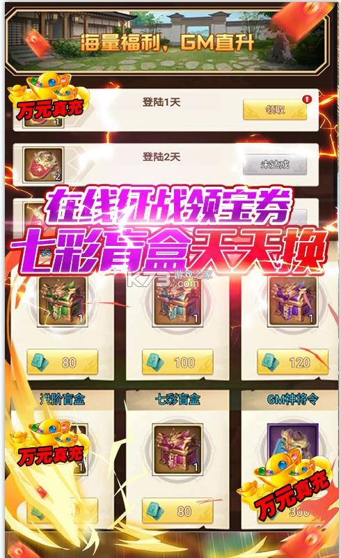 ★每日活跃送GM神将令,参与GM寻宝,海量极品道具、GM神将;活跃赠送七彩盲盒,开出稀有宝箱。
