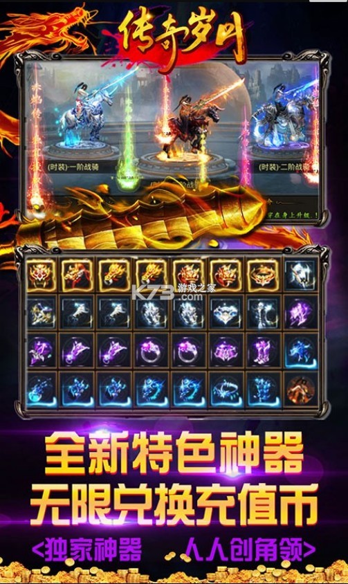 独有的骑战特色时装,带你感受传奇骑战的新乐趣,神器人人可爆,小怪爆一切、爆终极!