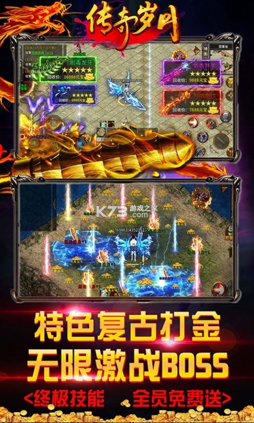 传奇岁月 这是一款24小时自动挂机RPG游戏。传承经典传奇故事背景与三大职业,搭配多人竞技,万人团战,极品炼狱,行会系统等特色玩法,还原传奇世界,杀光、抢光、掠光等热血战斗画面。杜绝微操,不管你在线还是离线,各种收集,不用点击,直接爽到爆炸。传奇岁月是一款大型即时制角色扮演类手机游戏,以网页构架形式展现海量用户同场景的游戏互动;采用丰富活动玩法和角色成长养成相结合的模式,一款采用了经典的魔幻传奇题材的角色扮演类手游,游戏中有着非常熟悉的复古元素的游戏场景,精致的魔幻元素画面风格,熟悉的战法道三大职业,一起抒写你的传奇人生!