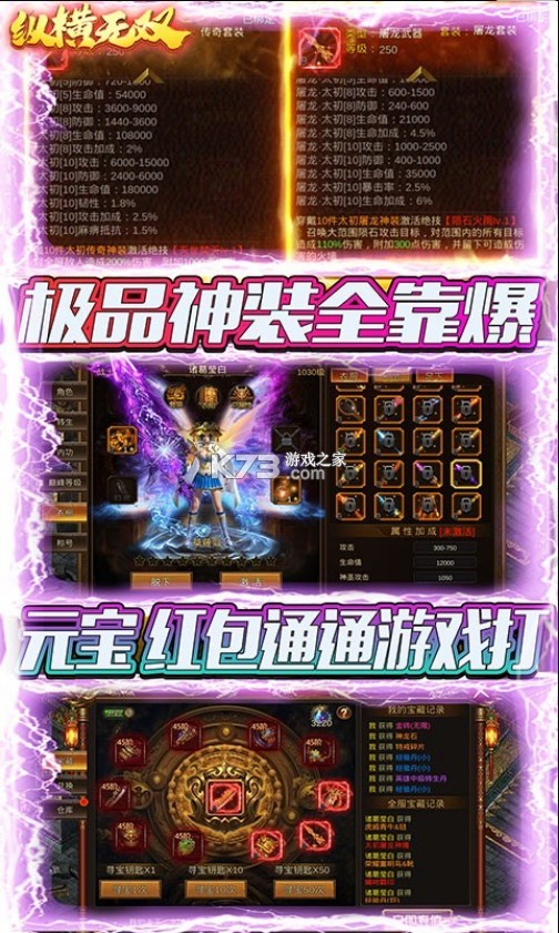 纵横无双传奇是一款全新高人气的热血传奇类型的游戏,这款游戏完美的融入了经典传奇中的游戏魅力,丰富的主线以及副本任务可以随时的打落更多稀有的装备让,给你不断的提升自己的攻速,开放式的商城以及羽翼系统,纵横无双传奇官方版热血之战传奇之战开启刺激的对战体验,多种游戏方式为玩家带来热血传奇体验,不同的攻击方式为玩家带来更多的战斗体验。多种战斗元素享受热血传奇过程,各种沙城冒险享受一场新的乱斗过程,卓越装备多倍掉落,流光羽翼属性加强,完美还原交易体系,高自由度的战场设定,简单粗暴的人物操作,带你实现最原始的传奇玩法,超过上百玩家同时在线,带你体验往日的热血与激情,游戏内置夺宝玩法,超多元宝、稀有道具、材料等你来抢夺。