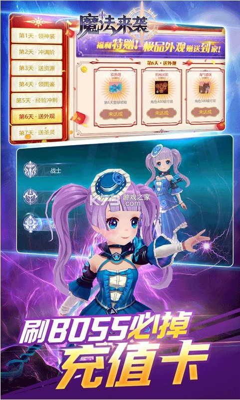 《魔法来袭爆充值卡版》是一款史诗级的大型魔幻类游戏,游戏上线就送vip12,还有无限充值卡礼包,每天上线都能够免费开充值卡,击杀boss百分百能够掉落充值卡,钻石拿到手软。