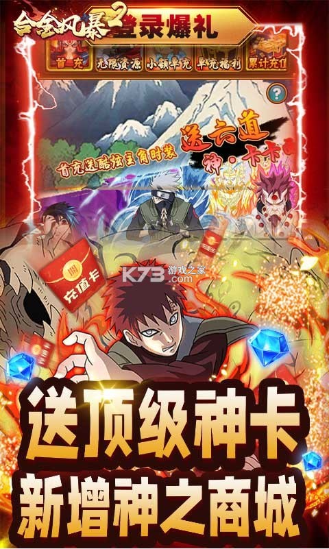本款游戏是一款以火影为题材的卡牌类游戏,玩家在木叶村开启一场梦幻的旅行,为保护村子,玩家继承火之意志,寻找伙伴组建属于自己的队伍,与各路黑暗势力展开激烈交锋,玩法独特新奇,上线就赠送全图建卡,巅峰阵容任意搭配,每日还可领取顶级神卡,全图掉落万元真充,福利拿到手软,还在等什么呢!快来继承火之意志与鸣人佐助并肩战斗吧!经典火影卡牌再现,究极对战超燃!上线就送至尊GM、海量钻石、金币、豪华开局福 利,尽享极品特权!更有爆款无限资源,金币、钻石、材料,一次购买,无限免费领取 ,让你玩到爽、领到爽!神卡、神装登录就送,面对忍界邪恶势力,超爽福 利,助你热血一战!