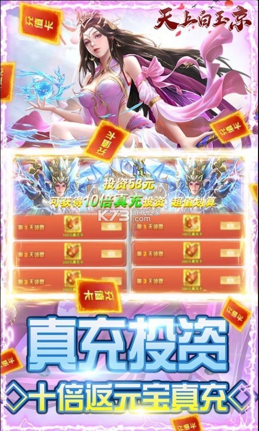 天上白玉京(送万元充值)是一款3D国风仙侠MMORPG手游。创角即送满级vip10、史诗神将--孙行者、元宝*188888、金币*3888万。另上线可领取万元充值卡,超值投资百倍返利,超级神将寻宝无限抽,分分钟集满!