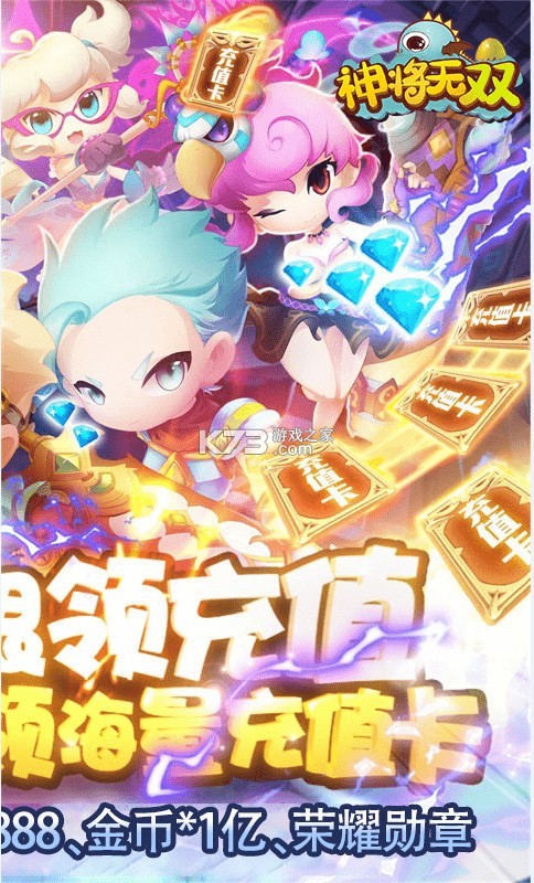 《神将无双(在线送充值)》是一款富含经典动漫元素的Q版手游梦幻传承之作。上线就送VIP15、钻石*128888、金币*1亿、荣耀勋章,在线领取充值卡。拥有六大非传统职业、深邃悠久的剧情背景、精美绝伦的动漫风情、酣畅淋漓的战斗技能、萌酷霸炫的宠物伙伴、温馨自由的公会建设、丰富多彩的线上竞技、其乐无穷的副本探险、震撼人心的BOSS挑战,你将感受到前所未有过的游戏体验,与你的同伴携手创建堪比莫里亚斯教团的集团组织,构筑属于自己的史诗传奇!一款让你畅游三国的策略手游,其内能够进行自由的组合搭配,同时更有野外boss让你随机斩杀获得众多奖励,更有激情无限的互动娱乐环节,热门活动,热门任务,让你能够与情侣一同完成任务,
