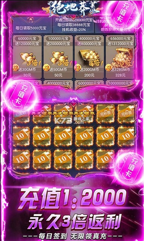 5、充值1:2000,永久3倍返利即每次充值1:6000,再送GM金币,任意一抽必中千万战力极品神器!