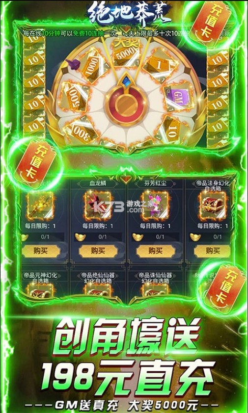 绝地莽荒(GM天天送真充)创角壕送198元直充,免费送GM,全场极品神器时装坐骑羽翼,千元真充,每日1元宝无限购!BOSS永久无限爆充值,神装百倍爆率!GM宝库任意一抽必中千万战力极品神器,开局碾压全服!开局送SVIP5,GM1特权,元宝*888888、铜钱*1亿、永久时装,绝版称号,签到无限领真充!全地图自由飞行,千人同屏,华丽特效,三界大战一触即发,百变时装,拉风坐骑,神兵仙器带您叱咤三界,畅游最精彩的玄幻仙侠世界。一款仙侠角色扮演手游。人物塑造华美飘逸,职业搭配精心设计,不同职业自由选择,技能设计匠心独创,华丽技能酷炫战斗,画面表现震撼惊艳,让你在精彩不断的战场上酷炫战斗,真实唯美的风貌,在搭配上极致有趣的故事剧情,自由探索这个有趣的世界,仗剑行走天涯,上天入地不是梦,所见之处皆可遨游,山河湖海日月星辰逼真展现,为玩家展现一个缥缈隽永的神话境地。