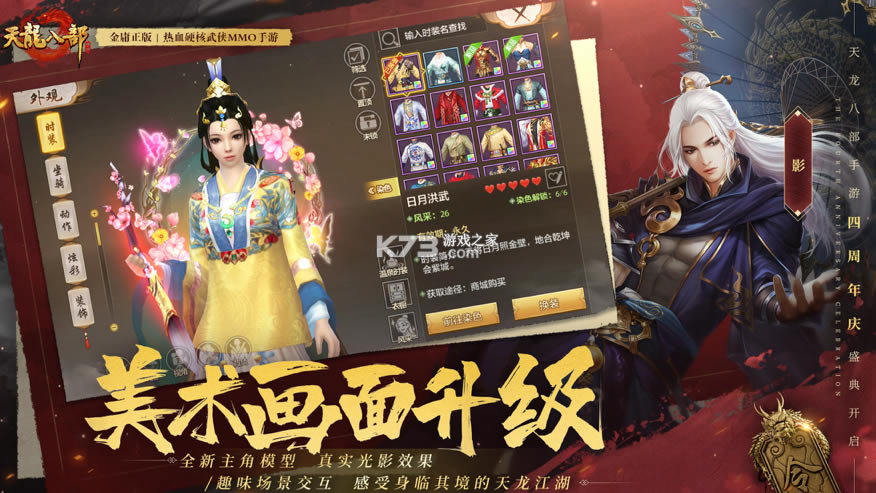 洛阳东风今日来,川波岸柳春全回。正值四周年盛典,美术画面全面升级,全新主角模型,真实光影效果,更有凉亭、古筝趣味场景互动,身临其境感受江湖。