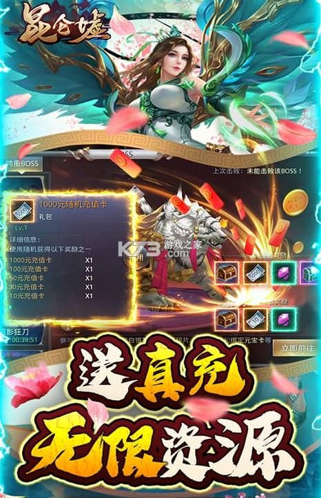 【昆仑墟】上线赠送SVIP1,30W绑定元宝,100W铜钱,还有纳米核心和未来时空之翼炫酷体验时装;欧皇开真充,参加跨服boss和冰火战场可以获得随机真充卡,最高可得千元真充卡;全新无限资源阁,每日免费领取属性丹和经验丹,成长快人一步,达到条件后还可获得无限元宝,每天随便领,点多少领多少,从此银行是我家!