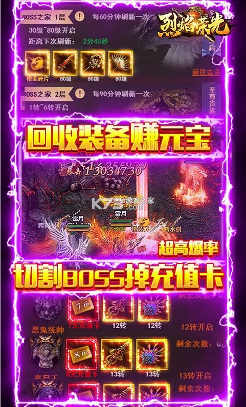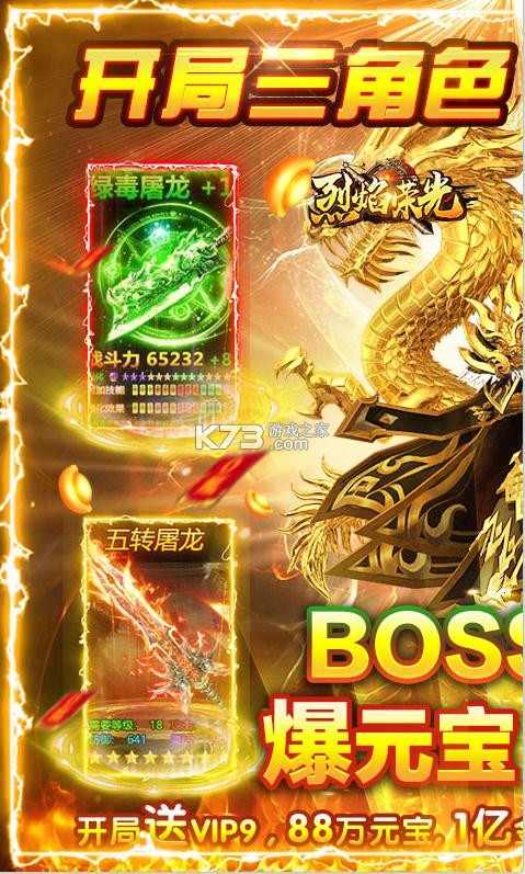 《烈焰荣光》送神剑和精美的时装,0氪金签到打boss掉超多的钻石,回收装备赚更多元宝,送高级的材料,超多boss爆无限元宝版,三角色共同的操作,重温沙巴克回忆,真实的实现,赶紧当上沙城 的霸主吧。