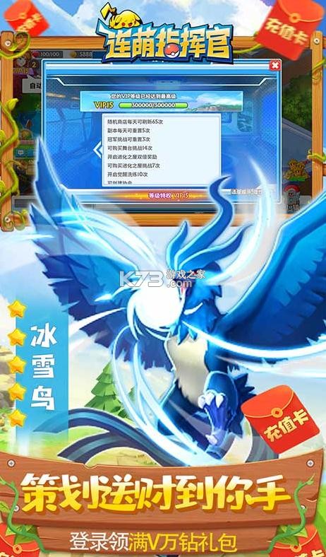 上线即送VIP15,128888 钻石,2000万金币,58888精灵币。首充再送超强神兽!绝版好礼与超值福利,100%还原童年口袋世界,自由进化,随心所欲个性养成。火爆PVP,全球同台畅爽激斗,最具挑战性的游戏剧情!最棒的冒险尽在《连萌指挥官-天天领充值》