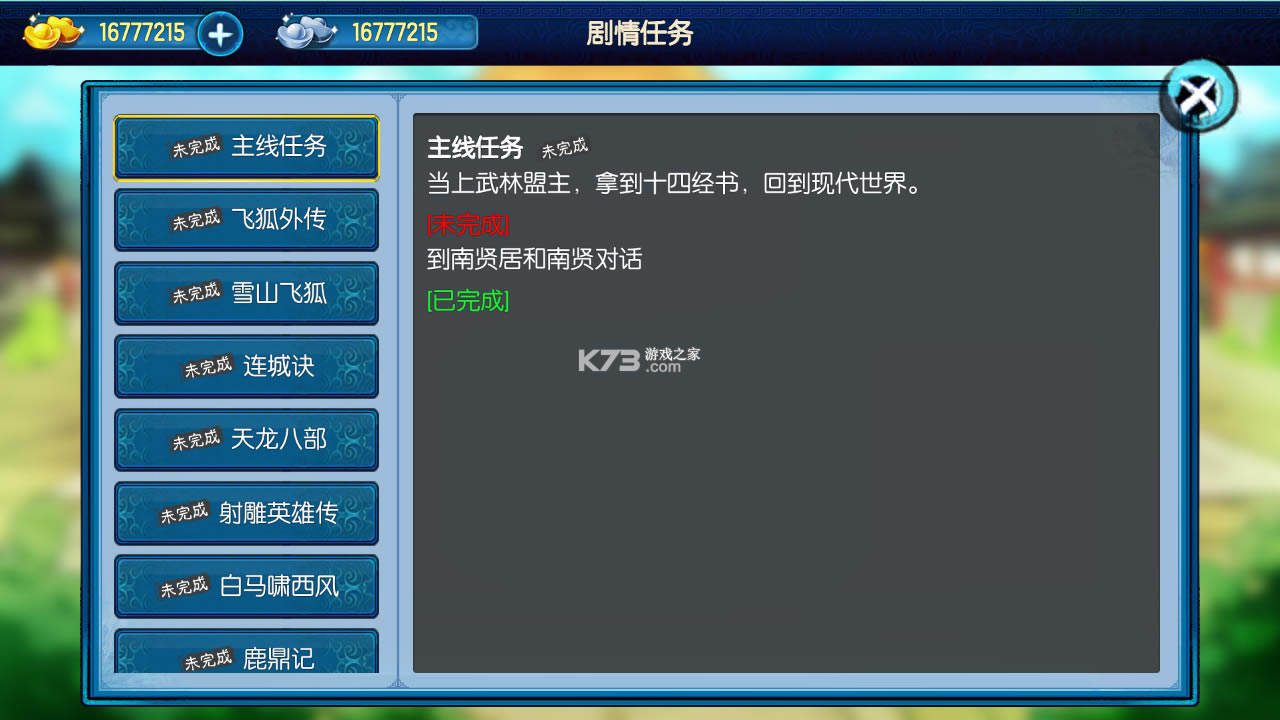 你将扮演穿越到武侠世界的玩家,在江湖中周旋于各大门派,学习武技结交侠客,参加武林大会夺得武林盟主之位。在收集十四天书后根据你的正邪路线,迎战武林中的恶人或者侠士。