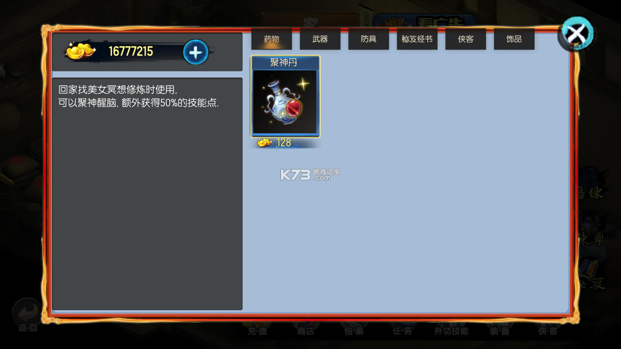 上百种的江湖绝世武学,不限制学习的武功数目,通过战斗或者搜寻武学笔记获得武学经验。通过冥想总结将武学经验转化为技能点,用于学习和升级武功。附带各种Buff和DeBuff的神兵利器,助你挑战武林顶尖高手。