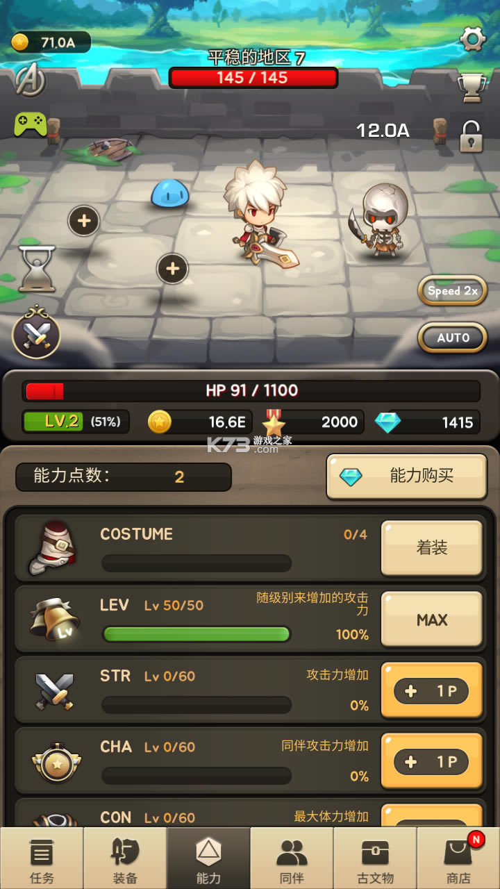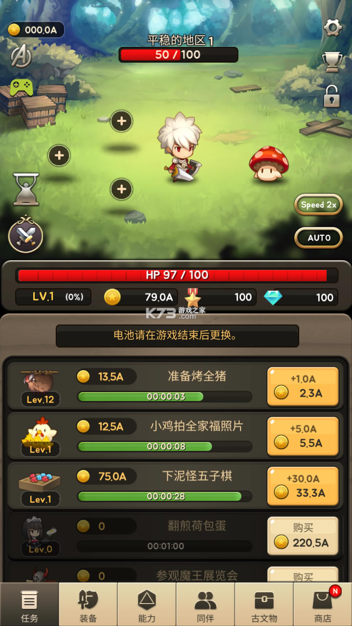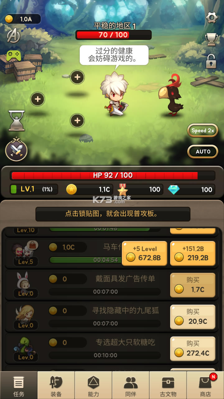 是一款放置型RPG冒险手游,游戏采用竖屏卡通风格设计,Q版二头身人物手拿兵器和盾牌的样子十分可爱,我们将扮演小英雄,前往副本打怪战斗,获取宝物,不断升级成长,这里有救援地下城、古文物地下城、冲破城门等丰富副本供你挑战试炼,大量金币钻石、稀有神级武器等你坐收囊中。另外,除了放置自动战斗外,进攻之神同样拥有精彩的技能和连招,普攻和高级必杀技组