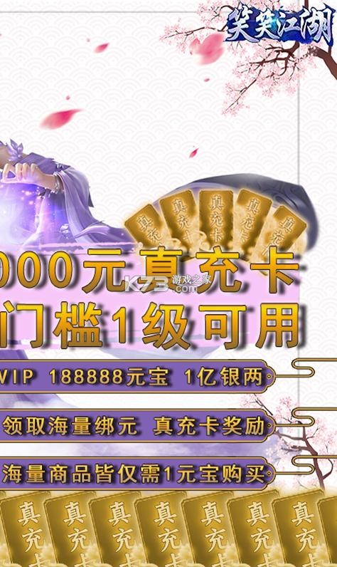 《笑笑江湖》送超强充值卡,商城超多道具物品只需要1元宝,上线就送GM4,领取超多的真充福利,998真充满级vip,无门槛1级才可使用,免费升级活跃度系统每天上线领取超强福利,每日可享真充福利,统统都送福利超多。