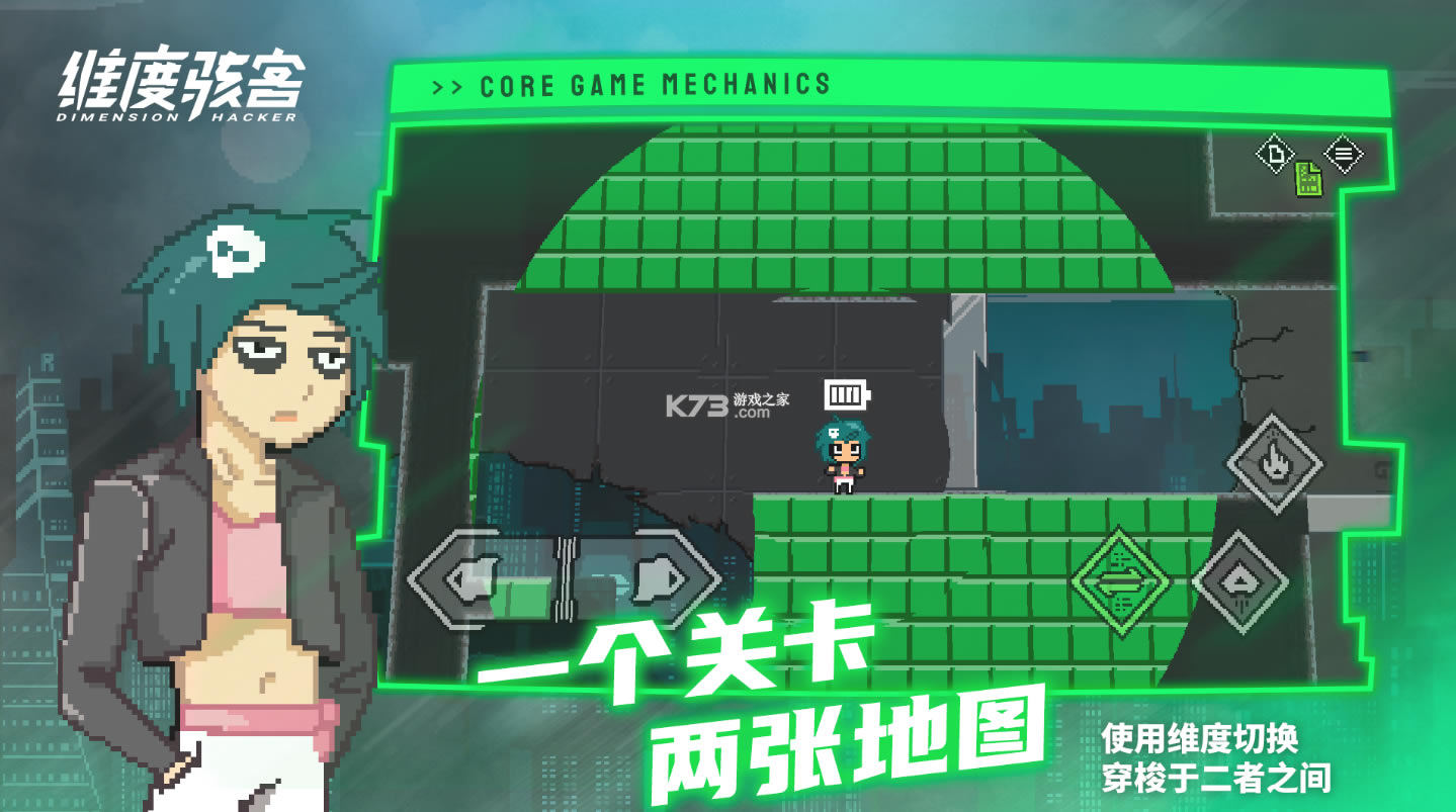 《维度骇客》是一款赛博朋克主题的平台跳跃游戏,游戏中玩家能体验到经典的趣味跑酷跳跃,多种不同的趣味游戏内容,经典的休闲游戏玩法,好玩的趣味休闲游戏时光,给你带来最棒的传奇游戏体验,相信不少的用户都会喜欢,主角“逆变”是一名可以穿梭于两个世界的超级黑客,她将借助这一能力,尝试从 FULLTECH 公司手中拯救所有黑客的命运。