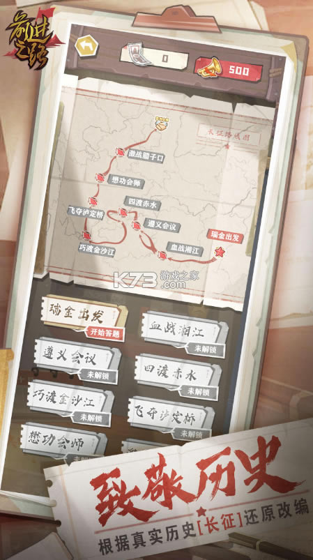 《前进之路》根据红军长征史实改编,在游戏中玩家将扮演长征队伍中一名士兵,真实体验长征之路的各种艰辛感受崇高的革命信念,同时在游戏内你还要合理的规划前进路线,避开各种未知的危险,带领你的小分队顺利的完成长征之路,感受长征的伟大历程。崇高的革命信念,以及合理的团队组织,资源统筹和路线规划,都是帮助红军战士们冲破种种艰难险阻,夺取长征胜利的关键。