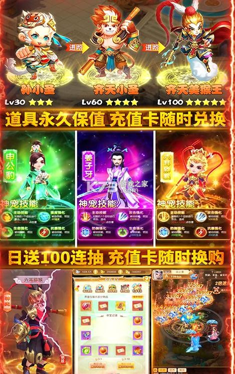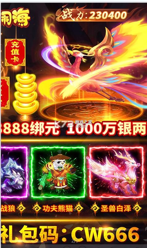 游戏登陆即送万元充值卡,每日还可免费领取100连抽,做任务再送100连抽,充值卡免费兑换。另开局输入礼包码CW666、SZ888,还可领取时装·甜蜜童话+神宠·六耳猕猴。