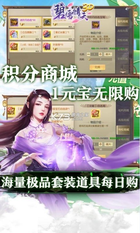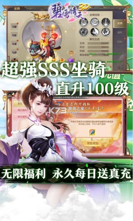 《碧雪情天3D-送10000真充》上线壕送10000元真充,登录送1000积分可激活积分至尊商城,极品道具每日1元宝/1积分无限购!无限福利永久每日领10元真充值卡,10积分卡,无限十连抽!1元即送酷炫坐骑碧蓝炎龙,再送直升100级经验丹!无敌资源,98送500真充,功夫·宗师,斗皇套装任意领!开局送vip10,元宝*88888,仙羽-流光金翼,绝版称号-不服来战,银两*3000万!3D玄幻仙侠RPG手游,特色拉风坐骑、时装羽翼华丽加冕,百变时装,Q萌灵童,神兵利器唾手可得,千人同屏,激情暴燃仙界大战一触即发。