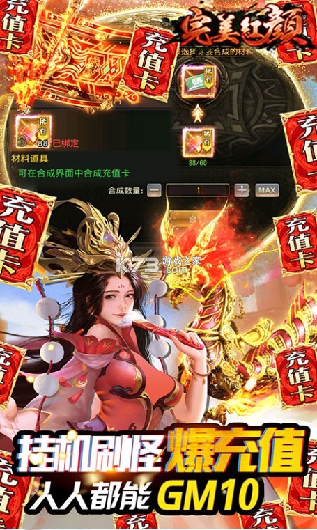 ★打怪爆充值,挂机可获得大量充值卡及充值卡碎片,合成充值卡获得大量元宝,免费提升GM等级,人人都能GM10!