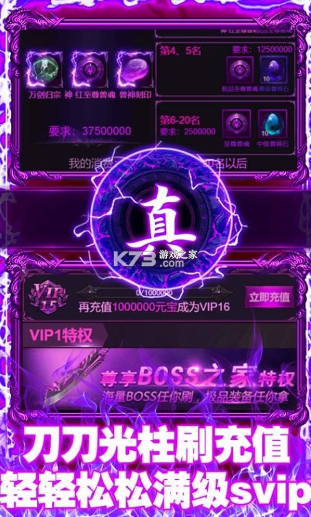 ★上线送vip15,元宝88888、金币*10000万、热血神剑(1阶)*1、雪国精灵(角色时装)*1、500元真充卡