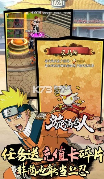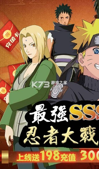 1、正版火影动漫授权;上线送198元真充值卡,使用既得99000钻石、300万金币、直升VIP10;