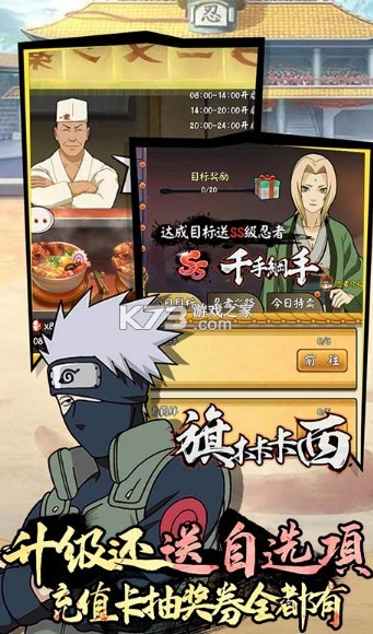 6、升级送500元充值卡 or 1500张忍者券,开放福利,自选道具体验!