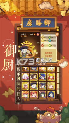 放置类型的中华餐厅模拟经营手游。游戏主打轻松挂机玩法,玩家在游戏中要扮演各种不同Q萌画风的厨师(娘),烩制各种美味可口的菜肴