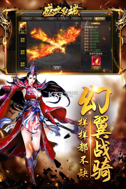《盛世皇城》里拥有游戏史上强大的坐骑养成玩法,辅助技能、骑乘装备、进阶等功能都一应俱全。目前已有的种类不但包括了众多种拥有优良品种的战马,还有熔金兽、风狼王、电光豹、银虎妖、天蓬骑、飞焰巨头狮等,后期还可以拥有火云崩天兽、震天金象等神兽等等,给玩家在游戏里赋予更多个性色彩。