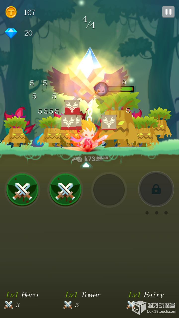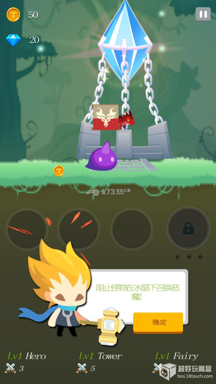 怪物们想去破坏水晶,移动你的角色摧毁怪物,不要让他们靠近水晶。