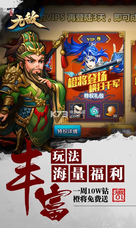 全民VIP特权,颠覆传统卡牌手游模式,丰富多样的玩法,精彩刺激的PK对决,轻松简单的武将培养,惊险刺激的实时国战,