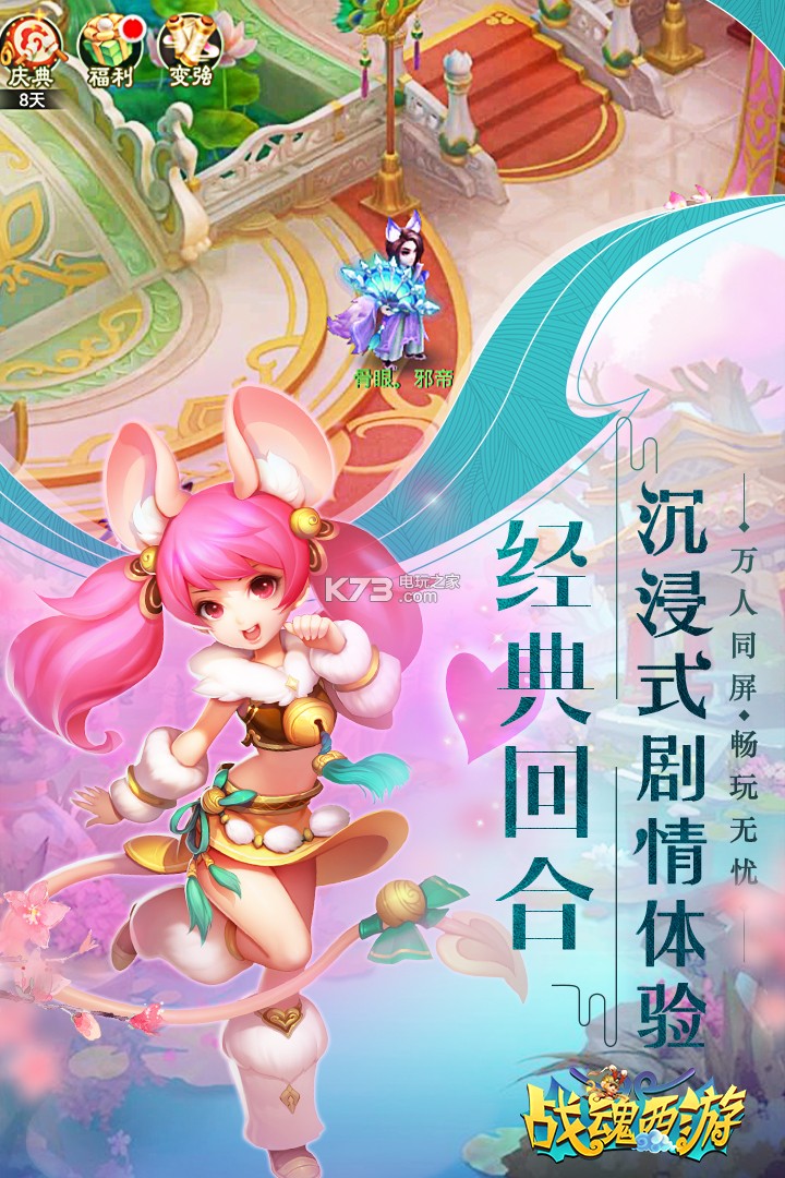 《战魂西游》取材西游经典剧情,独创【天女玩法】、【英雄救美】、【八十一难】等60余种丰富玩法,为你打造【360°立体社交】;更有一键减负、离线挂机,高概率合极品等良心机制,让你不花钱也可以玩得爽!轻松浪漫的回合手游,游戏福利全面升级,7天送【SS级珍兽】,累计活跃值免费领最新神兽!跨服PK赛火热开战,全民竞技,实时对决!