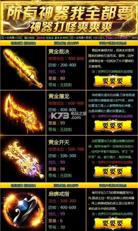 ★还有最强充值返利比例,元宝返不停,超猛线下活动,踏平沙城,称霸跨服都不再是梦,锤爆正式服大佬完全不成问题!还等什么,赶紧进游戏冲冲冲!