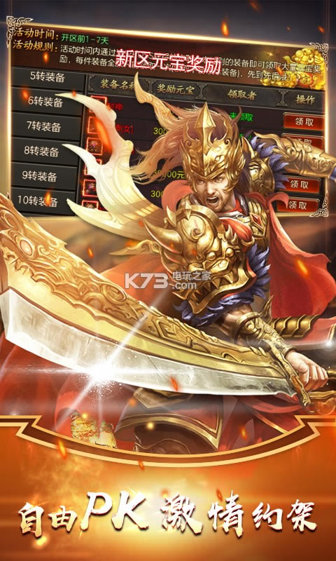 新手礼包: 价值30元、金砖(大)*3、绑定元宝*5000